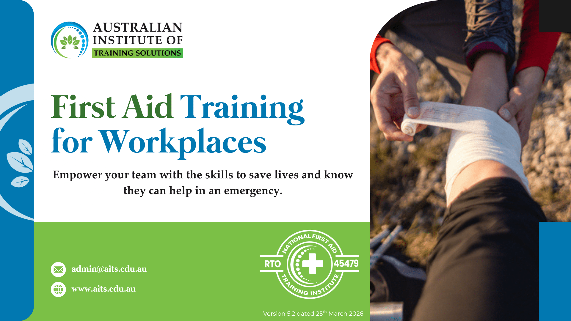 An overview of AITS group and corporate First Aid and CPR training options, including HLTAID009, HLTAID011 and HLTAID012, with flexible onsite or blended delivery to support workplace safety and compliance across Western Australia.